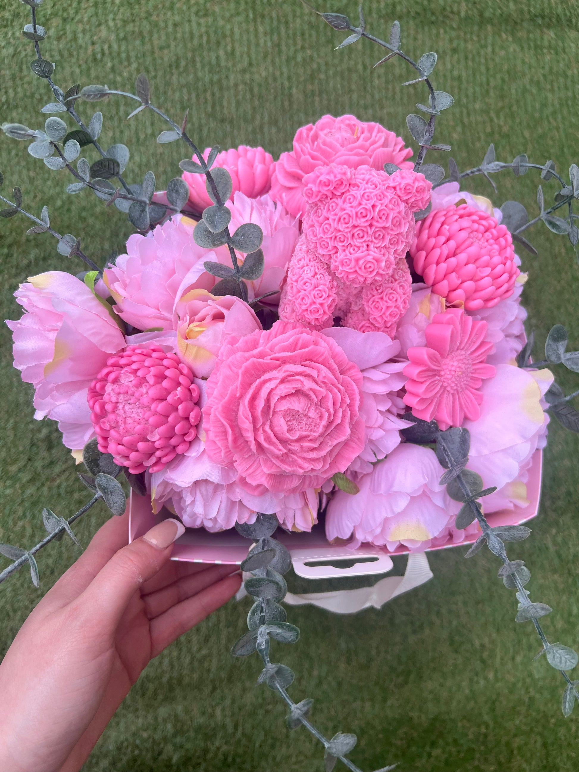 Each bouquet contains 6 flower wax melts and 1 teddy bear XL wax melt and numerous fake flowers.
